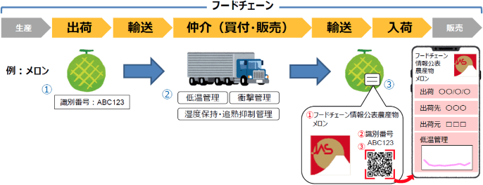 消費者は、JASマークとともに掲示される識別番号や二次元バーコードを利用して、産地・流通経路や、流通行程における品質管理等のフードチェーン情報を確認できるようになります。